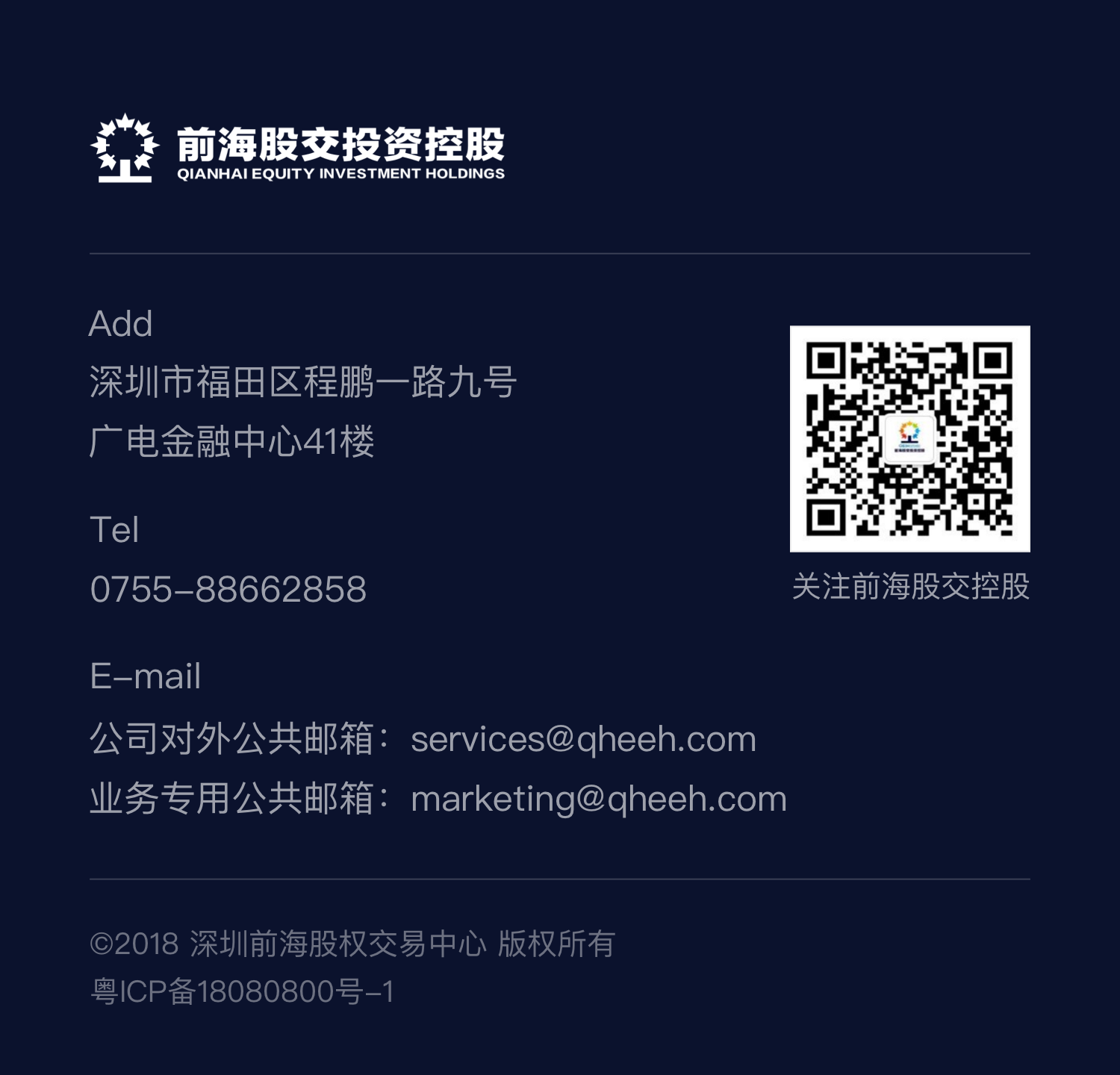 公司于2011年在深圳前海成立,前身是中国证监会为拓展多层次资本市场而特许设立、全国规模最大的区域性股权市场运营机构——前海股权交易中心;2018年经深圳市政府批准转型为投资控股型企业。目前,公司共参股深圳、江西、厦门3家区域性股权交易中心,并参控股20余家私募证券、私募股权、精品投行等专业子公司。